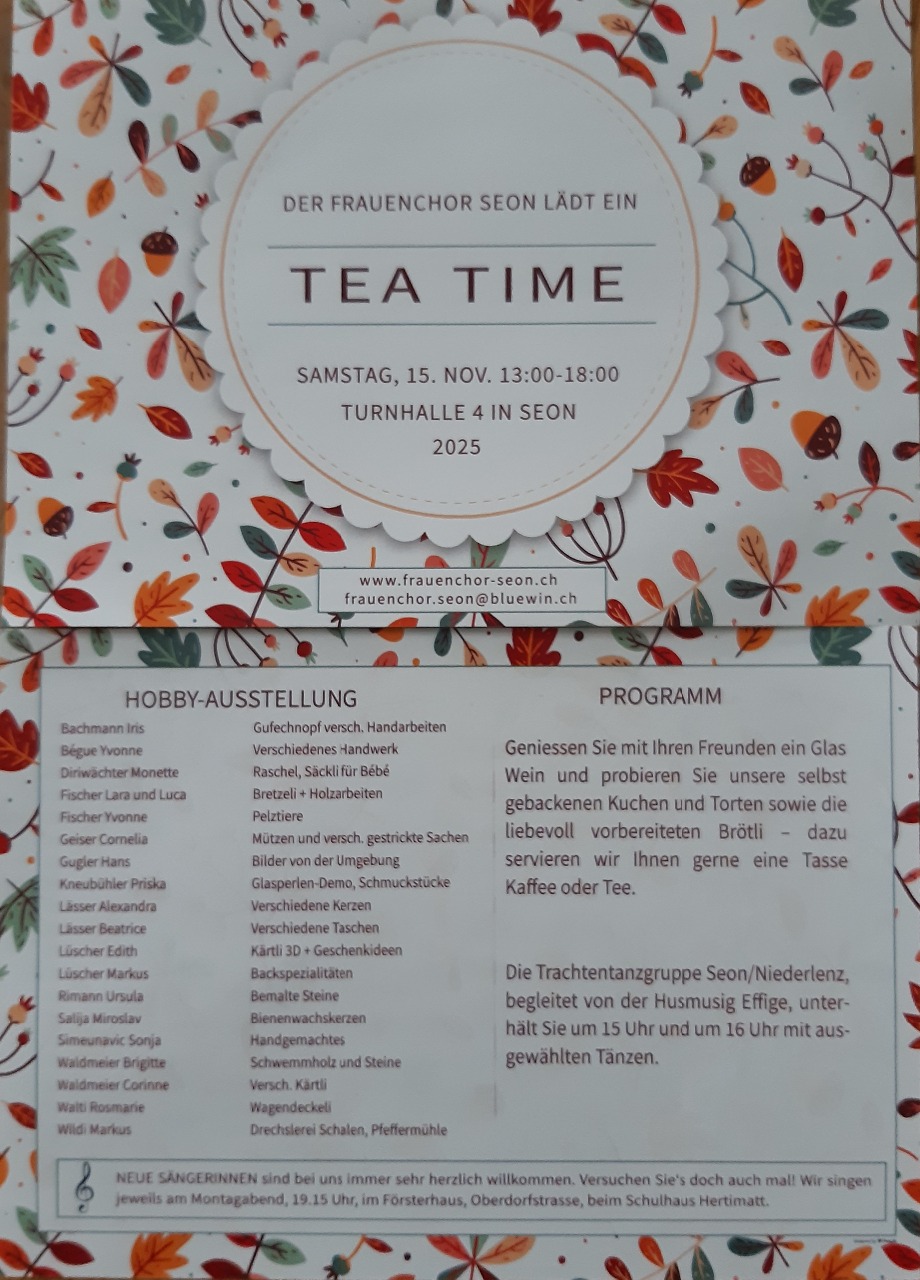 Wie jedes Jahr führt der Frauenchor Seon wieder ihr Tea Time durch. Geniessen Sie mit Ihren Freunden ein Glas Wein mit diversen Canapés, sowie unsere selbstgebackenen Kuchen und Torten, dazu eine Tasse Kaffee. Auch die Hobbyausstellung ist immer einen Besuch wert. Die Trachtentanzgruppe Seon/Niederlenz unterhält Sie um 15 Uhr und um 16 Uhr mit ausgewählten Tänzen, begleitet von der Husmusig Effige. Wir freuen uns auf Ihren Besuch!